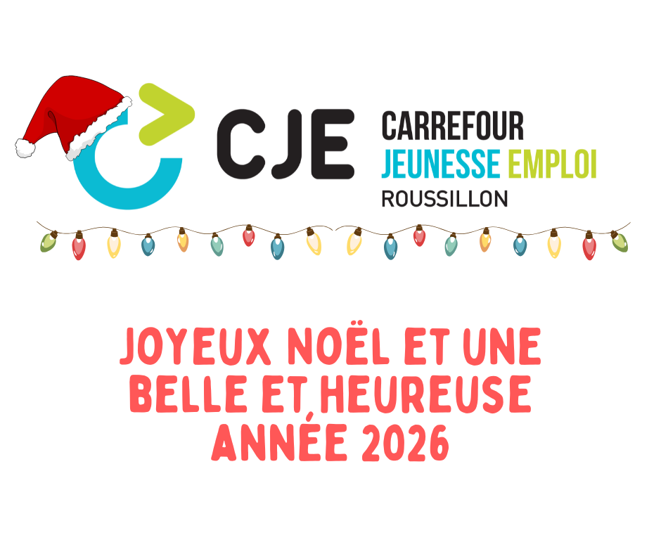 L'équipe et les membres du conseil d'administration du CJE Roussillon vous offrent leurs vœux les plus sincères en cette période du temps des fêtes. Bon succès pour la prochaine année! Nos bureaux fermeront à midi le jeudi 18 décembre et nous serons de retour en poste le lundi 5 janvier 2026.
